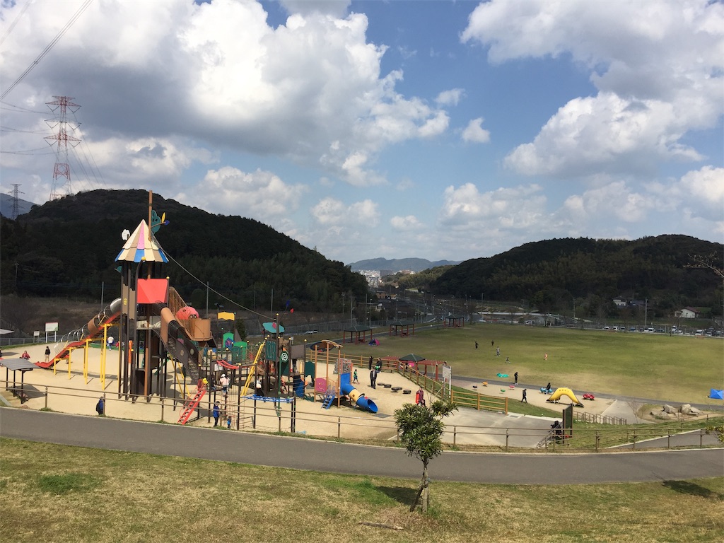 遊具エリアは高台になっており、麓には芝生の広場がひろがっている。